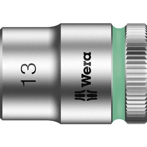 Douille à main et à machine (ISO 2725 – partie 3) signée Wera, permettant une utilisation manuelle et mécanisée. Avec repéreur d’outils « Take it easy » d’identification des calibres par couleur – pour trouver facilement et rapidement l’outil requis. Spécialement étudiée pour faciliter la préhension même avec des mains huileuses. Avec gorge de capture de bille. Pour vis à tête hexagonale et écrous hexagonaux. En chrome-vanadium, chromage mat.