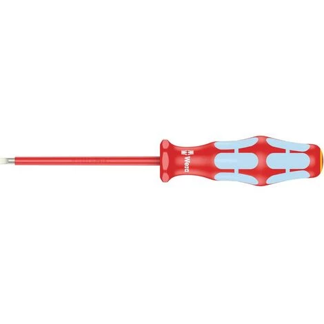 Tournevis VDE Wera en acier inoxydable. Pour des raccords haute qualité. Manche Kraftform multicomposant pour une vitesse de travail élevée et un vissage particulièrement ergonomique. Protection anti-roulement pour empêcher l’outil de rouler. Avec marquage de manche pour faciliter la localisation de l’outil. Avec pointe Lasertip : la surface microrugueuse vient mordre la tête de la vis. Réduction de l’effet de rejet. Réduction de la force de compression nécessaire. En acier inoxydable contre la rouille, ce qui évite également la rouille erratique. Lames VDE isolées, testées individuellement à 10 000 volts dans un bain d’eau pour travailler en toute sécurité jusqu’à 1 000 volts.