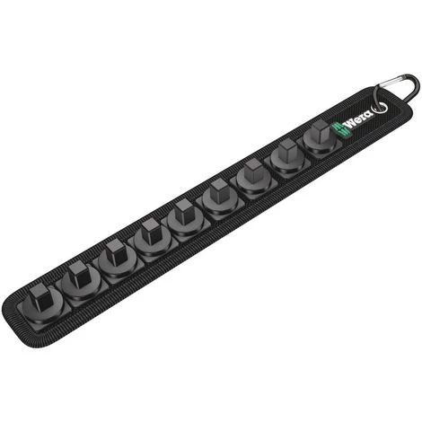 Sangle porte-outils en textile très résistant et design Wera, avec 9 douille-embouts (3/8) sur un espace réduit. Le mécanisme « Twist to Unlock », très souple, assure un maintien en toute sécurité et un retrait facile des douilles Un mousqueton permet la fixation au passant de ceinture ou à une sacoche. Verso en scratch pour une fixation simple, au mur, à l’étagère, à la servante d’atelier ou au système de transport d’outils Wera 2go.