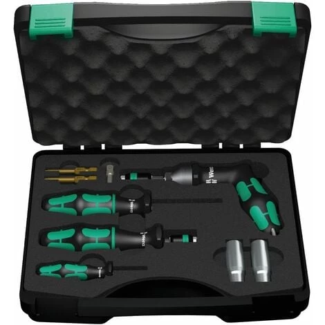 Set d?outillage, 9 pièces, pour installation et désinstallation dans les règles de l?art de systèmes de vérification de pression des pneus (Beru par ex.). Recours à la dynamométrique pour un serrage contrôlé des vis. Outils manuels équipés du manche multicomposants Kraftform permettant de travailler à vive allure tout en bénéficiant d?une ergonomie élevée. Deux outils préréglés, pour la jonction entre l?écrou-raccord et la vis et pour le vissage du corps du capteur à la valve. Un manche « pistolet » Kraftform à couple ajustable sur une plage comprise entre 4,0 et 8,8 Nm. Deux embouts TX à fonction de retenue, adaptateur pour douilles, deux douilles plus lame de maintien (adaptée à un serrage de 4,5 Nm max.). Convenant notamment aux systèmes de vérification de pression des pneus de marques Schrader®, Alligator®, VDO®.