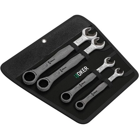 Jeu de clés mixtes à cliquet JOKER Quantité : 8 pièces, Contenu 8 10 11 12 14 15 16 18 mm – Revêtement Nickel-Chrome – Acier chrome-molybdène – Angle de travail côté anneau 4,5° – L’angle de travail de 30° côté mâchoire permet de continuer à visser sans tourner la clé Livraison: dans une pochette pliable. Avantage: La plaque en métal extra dure à dentelure côté mâchoire sert d’une part de butée d’arrêt ainsi que de maintien des vis et des écrous et elle permet, d’autre part, de réduire le risque de glissement en appliquant des couples de serrage plus élevés.