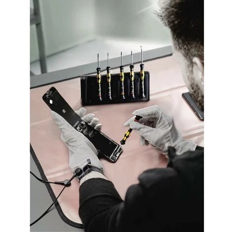 Jeu de 6 tournevis Wera Micro à sécurité électrostatique. Profils de vis inclus particulièrement adaptés pour une utilisation sur les téléphones portables et les tablettes. Protection sûre contre l’énergie électrostatique et les dommages associés. En appuyant la main sur la crête rotative et grâce à la zone de rotation rapide en-dessous de la crête rotative, il est possible d’obtenir un « tortillement » rapide comme l’éclair. Fini le repositionnement fastidieux de la main. La zone de puissance incorporant des zones tendres permet la transmission de couples de serrage/desserrage élevés. Zone de précision pour l’angle de rotation idéal lors des opérations d’ajustement. La pointe Wera Black Point offre un parfait ajustement et une protection optimale contre la corrosion. Outil de recherche de couleurs « take it easy » avec marquage par profil et poinçonnage de taille – pour trouver facilement et rapidement l’outil nécessaire. Ce texte a été traduit par une machine.