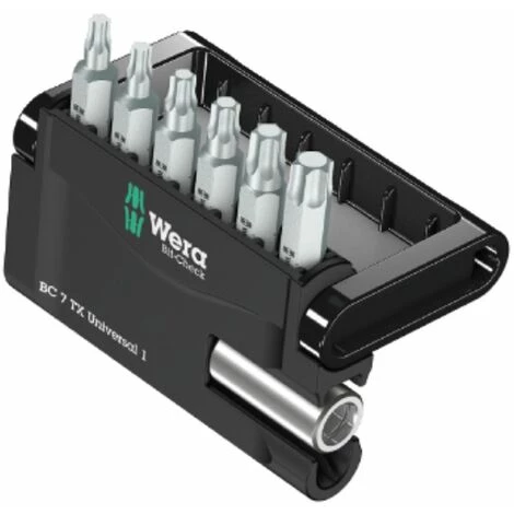 6 bits Wera Torx clairement disposés dans un espace confiné dans la vérification pratique des bits. Bits Wera dur pour les vis à douille hexagone. pour une utilisation universelle. 1 Porte-monnaie universel 893/4/1 K pour inclusion dans la machine à tournevis ou pour une utilisation dans l’alimentation de forage de la machine à forage électronique.
