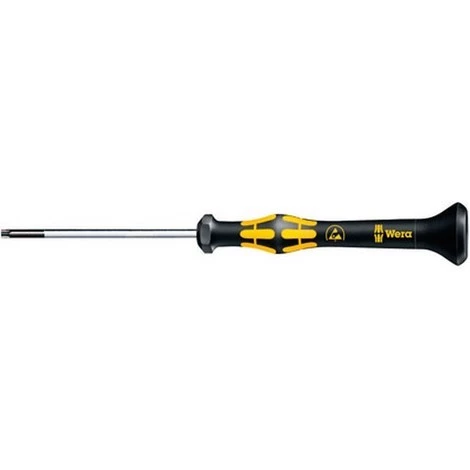 Tournevis électronique ESD TORX®, avec alésage Dimensions : T 7, Longueur de la lame 60 mm, Longueur totale 157 mm Tournevis électronique ESD Lors de l’utilisation d’outils sur des composants qui risquent d’être endommagés par une décharge électronique (ESDS – electro static discharge sensitive devices), les normes et les directives applicables (par ex. CEI TR 61340-5, DIN EN 61340-5, SP Method 2472) exigent la dérivation contrôlée des charges électriques par l’intermédiaire du manche de ces outils. Les composants sont ainsi protégés de manière fiable contre l’énergie électrostatique et les dommages qui y sont liés. Grâce à l’utilisation de circuits hautement intégrés, appelés IC, les appareils électriques sont de taille toujours plus réduite. Toutefois, les IC réagissent aux champs d’énergie électrostatiques la plupart du temps par des dysfonctionnements ou par une défaillance totale. C’est pourquoi il est indispensable d’utiliser des tournevis dotés d’une protection électrostatique. – Lame ronde – Nicromatt – Pointe Black-Point – Poignée Kraftform-Micro – Anti-roulement à 6 pans – Capuchon rotatif – L’énergie électrostatique est dérivée de façon lente et contrôlée