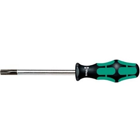Tournevis TORX® avec alésage, Dimensions : T 9, Longueur de la lame 300 mm, Longueur totale 381 mm, Ø de la lame : 4,0 mm – Lame ronde – Acier spécial fortement allié – Nicromatt – Pointe Black-Point – Poignée Kraftform-plus – Anti-roulement à 6 pans – Empreinte de la tête avec le symbole de l’entraînement et taille